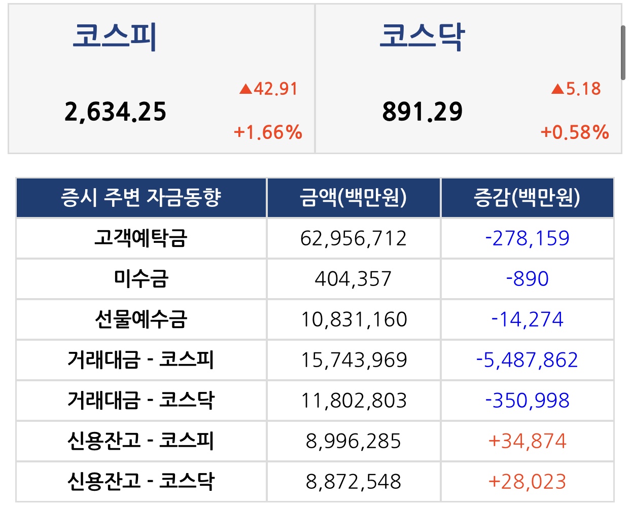 마감 지수 : KOSPI 2,634.25P(+42.91P/+1.66%)