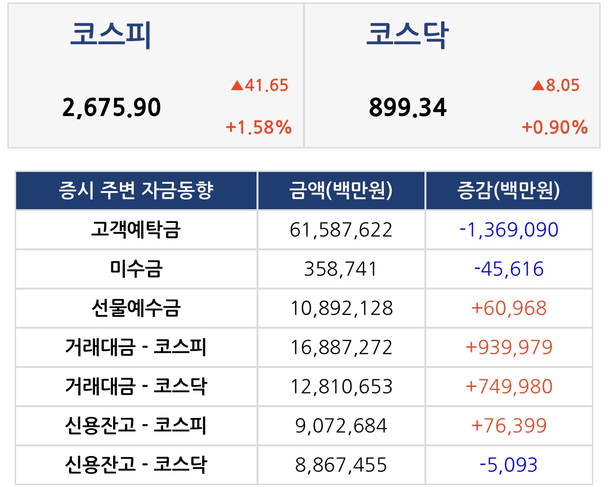 마감 지수 : KOSPI 2,675.90P(+41.65P/+1.58%)