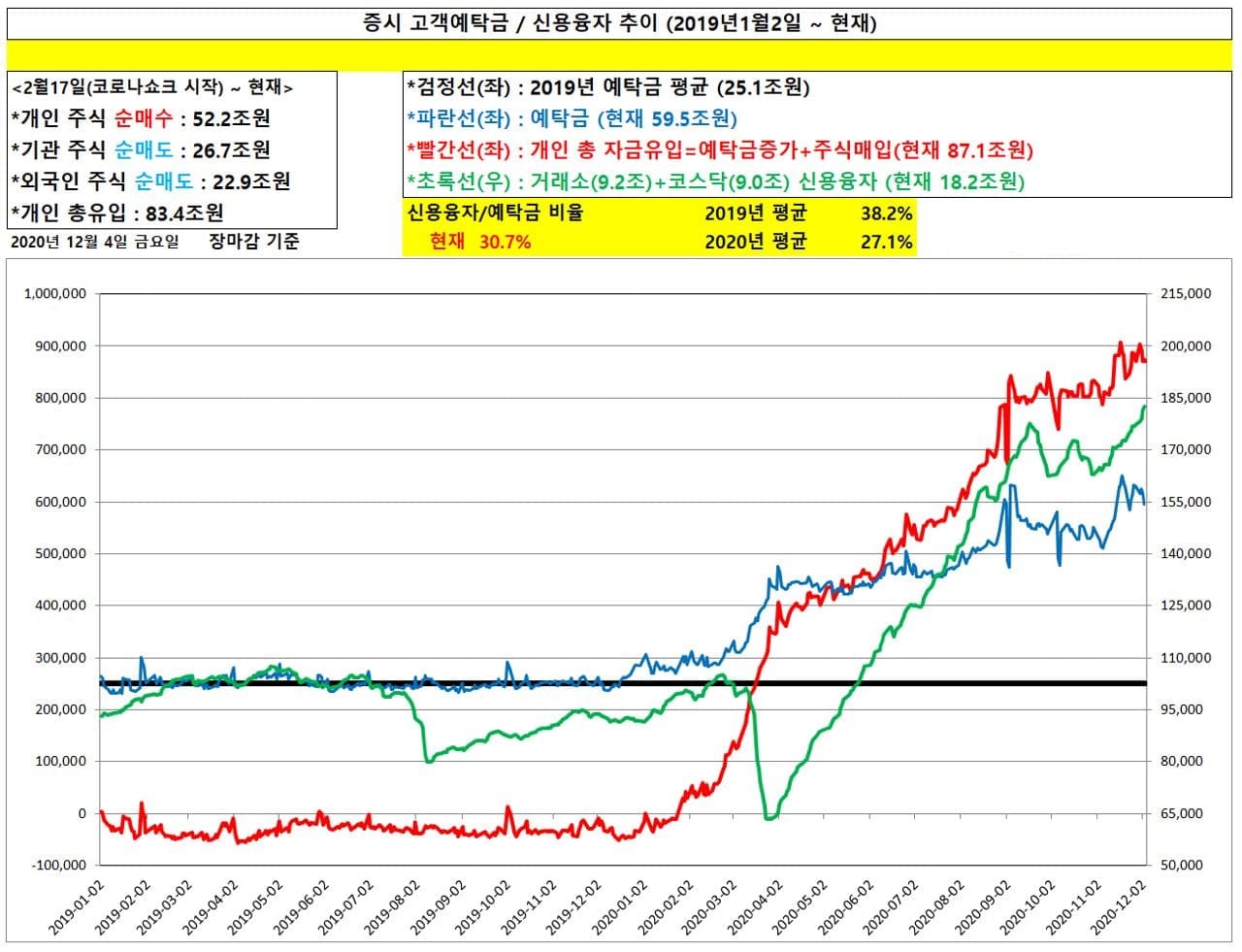개인투자자는 사실 잠재적 매수여력이 어느정도 인지 정확하게 추정하기 어렵습니다. 단지, 팩트만 언급해보면 2019년 연평균 25.1조원 이었던 예탁금 규모는 현재 59.5조원입니다. 또한 연초대비 개인투자자는 52조원의 국내주식을 순매수하였습니다.