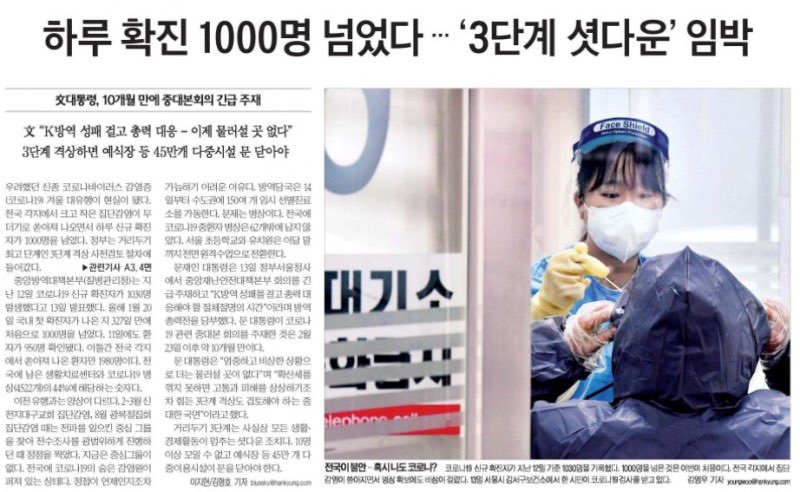 ● 하루 확진 1000명 넘었다…'3단계 셧다운' 임박