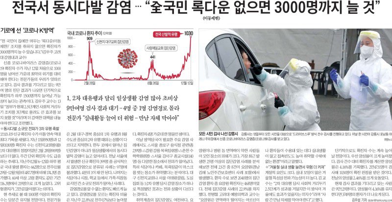 ■ 어제(13일) 발표된 1천30명은 코로나19 발생 이후 국내에서는 처음 들어보는 숫자였습니다. 게다가 검사 건수가 줄어든 주말이어서 충격은 더욱 컸습니다. 3차 대유행의 기세가 심상치 않자, 서울시교육청은 중·고등학교에 이어 서울시내 모든 유치원과 초등학교, 특수학교도 원격수업으로 전환하기로 했습니다.