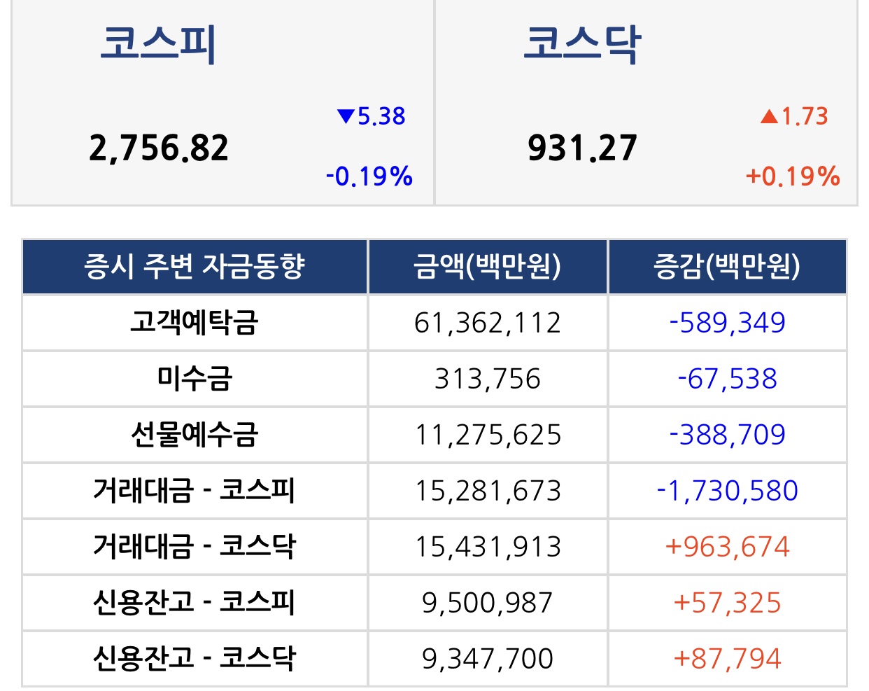 마감 지수 : KOSPI 2,756.82P(-5.38P/-0.19%)
