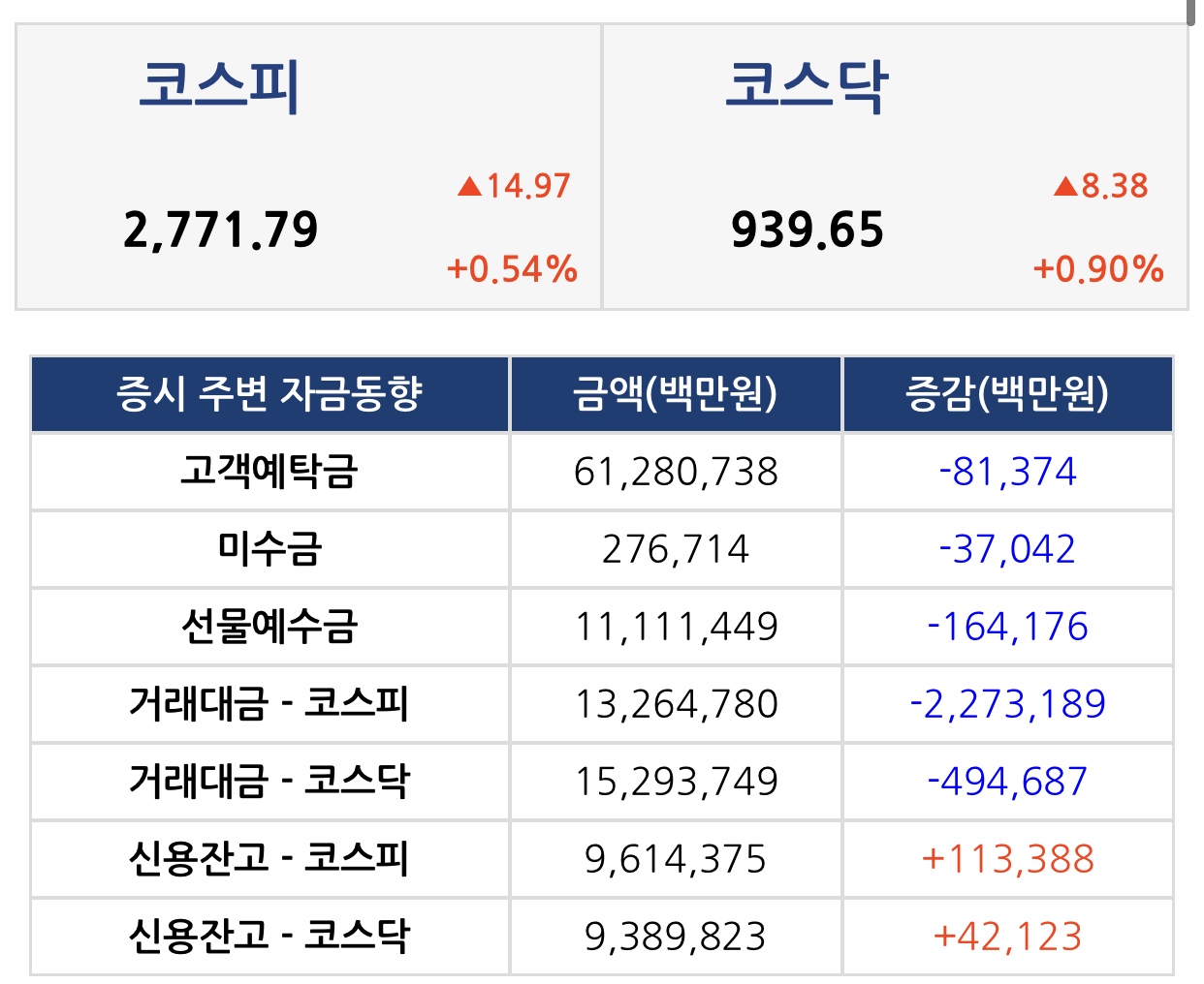 마감 지수 : KOSPI 2,771.79P(+14.97P/+0.54%)