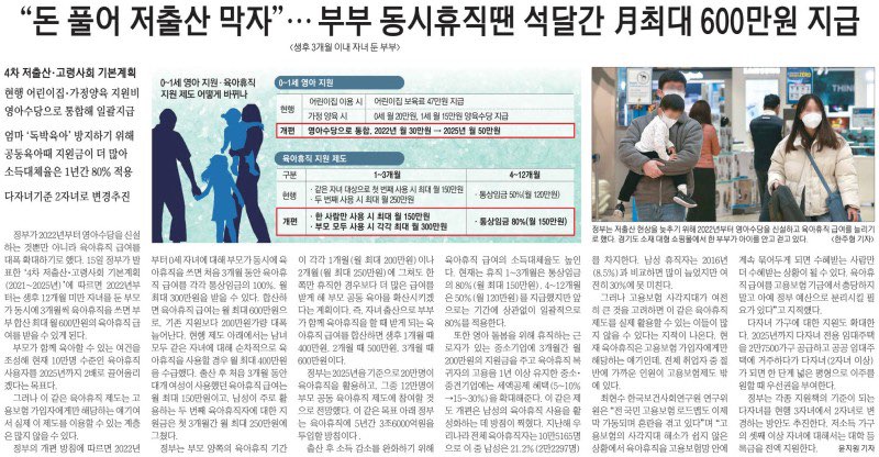 ● 자녀 출산 뒤 부부 동반휴직땐 월 최대 600만원 준다