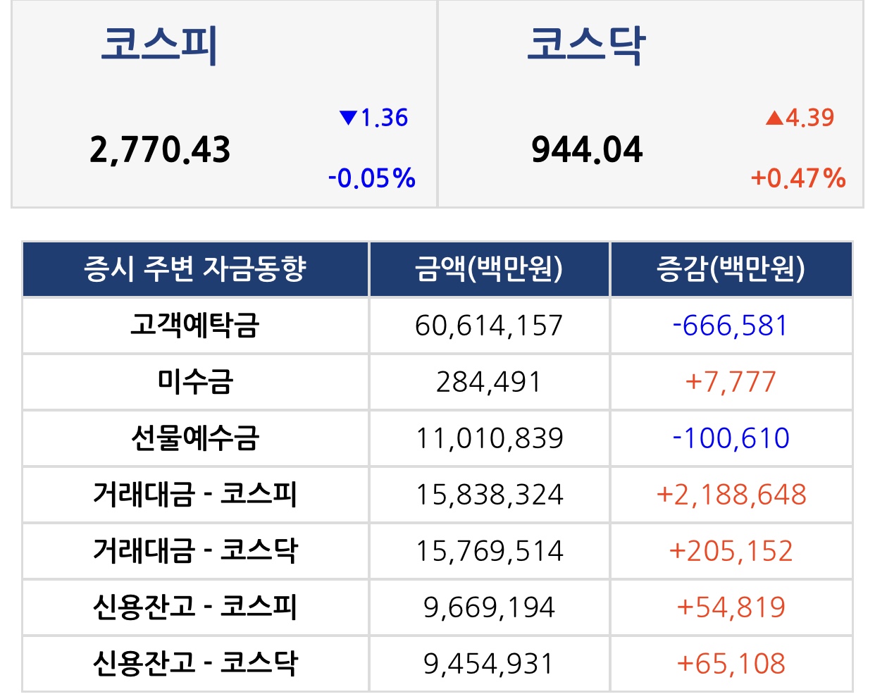마감 지수 : KOSPI 2,770.43P(-1.36P/-0.05%)