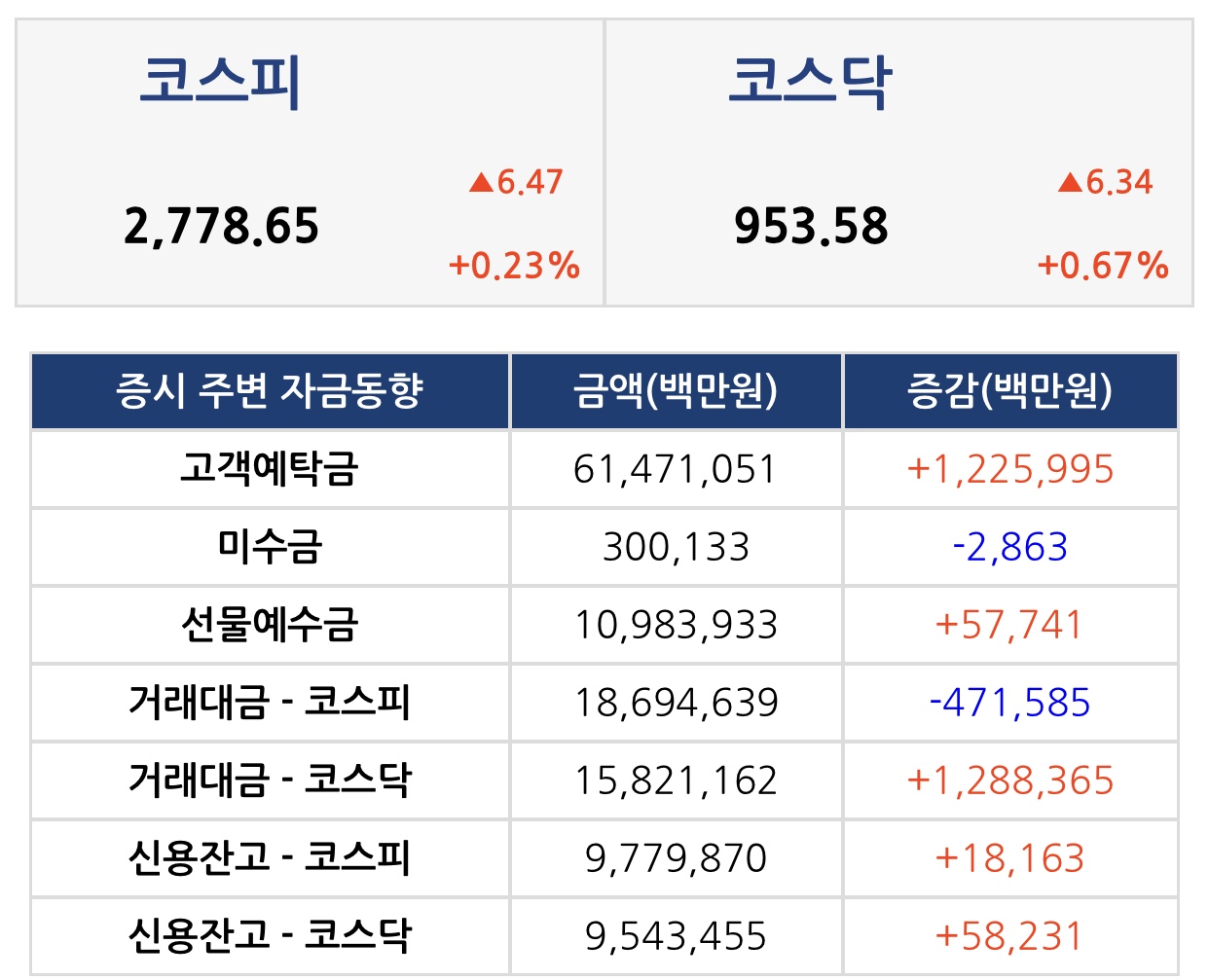 마감 지수 : KOSPI 2,778.65P(+6.47P/+0.23%)