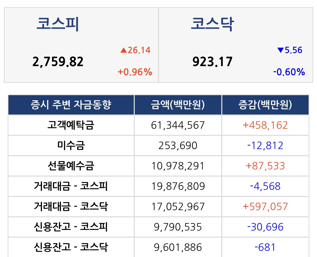 마감 지수 : KOSPI 2,759.82P(+26.14P/+0.96%)