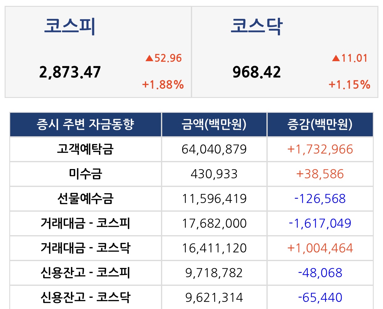 마감 지수 : KOSPI 2,873.47P(+52.96P/+1.88%)