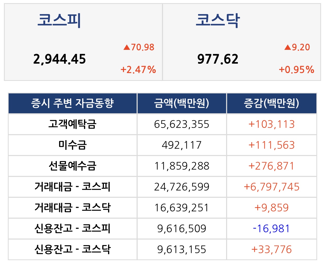 마감 지수 : KOSPI 2,944.45(+70.98P/+2.47%)