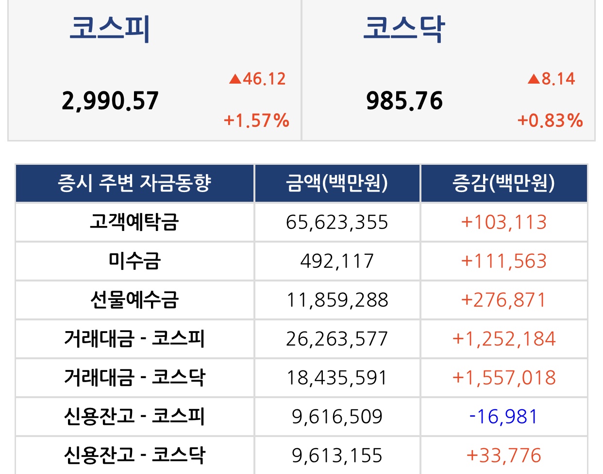 마감 지수 : KOSPI 2,990.57(+46.12P/+1.57%)