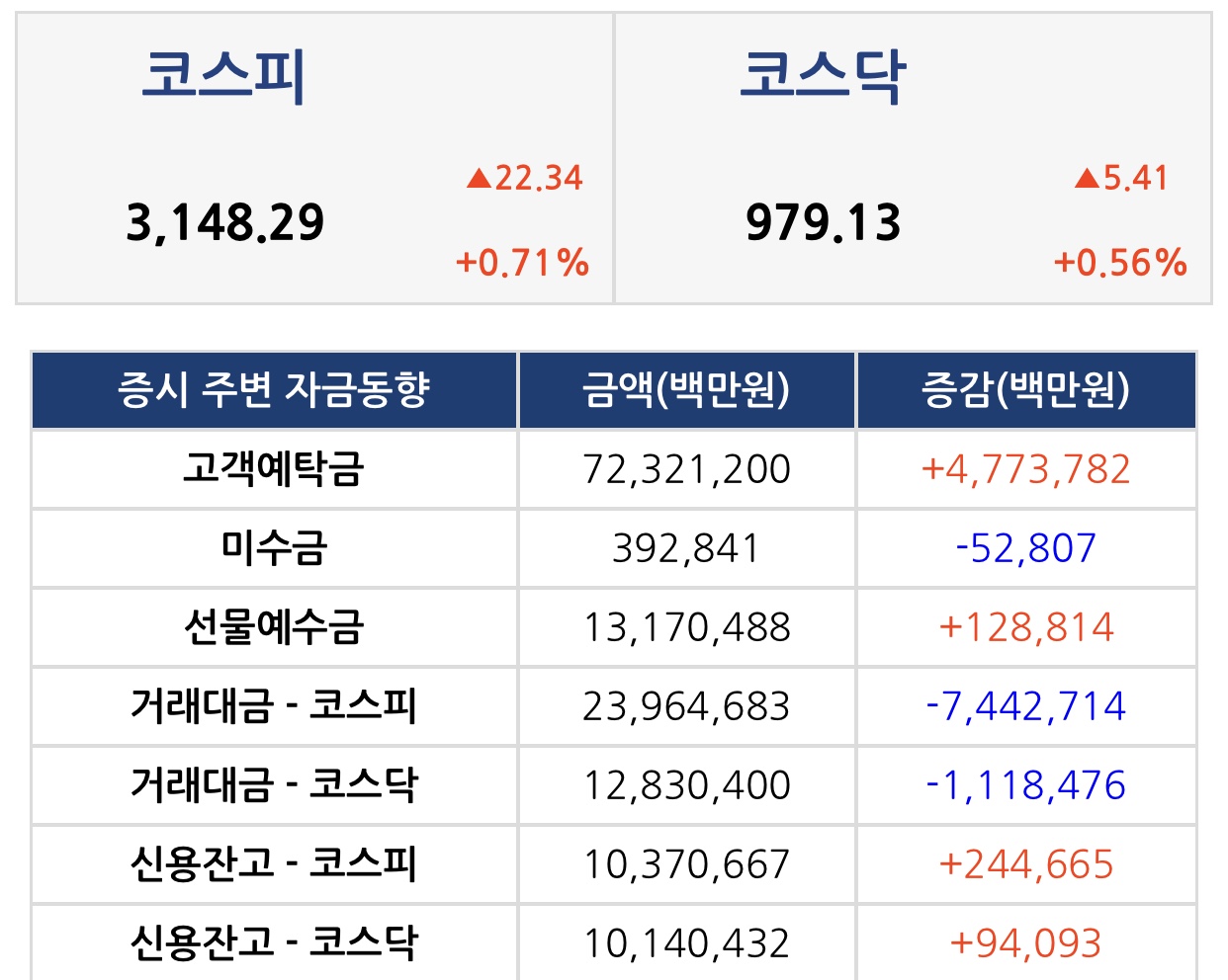 마감 지수 : KOSPI 3,148.29P(+22.34P/+0.71%)