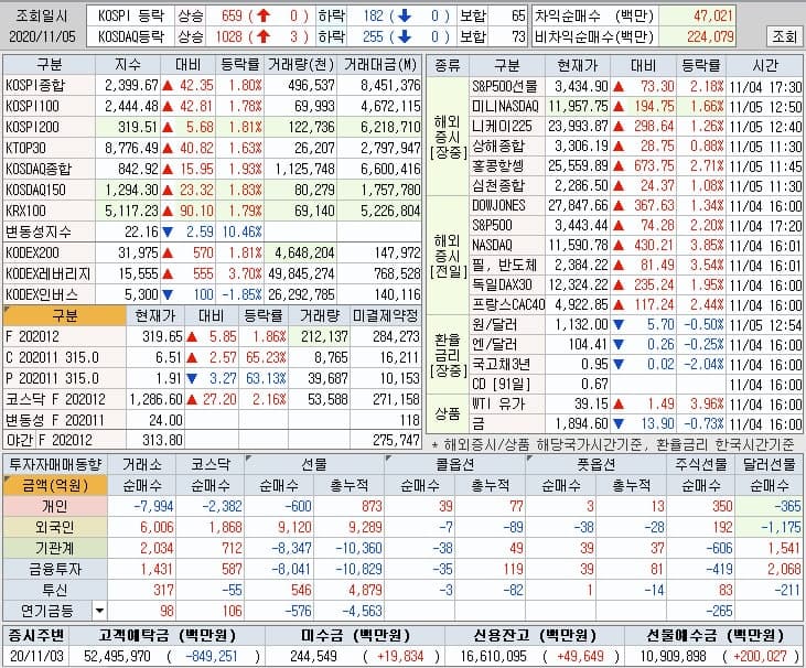 11/5 KOSPI 2,413.79(+2.40%) 바이든 당선 유력(+), 외국인·기관 동반 순매수(+)