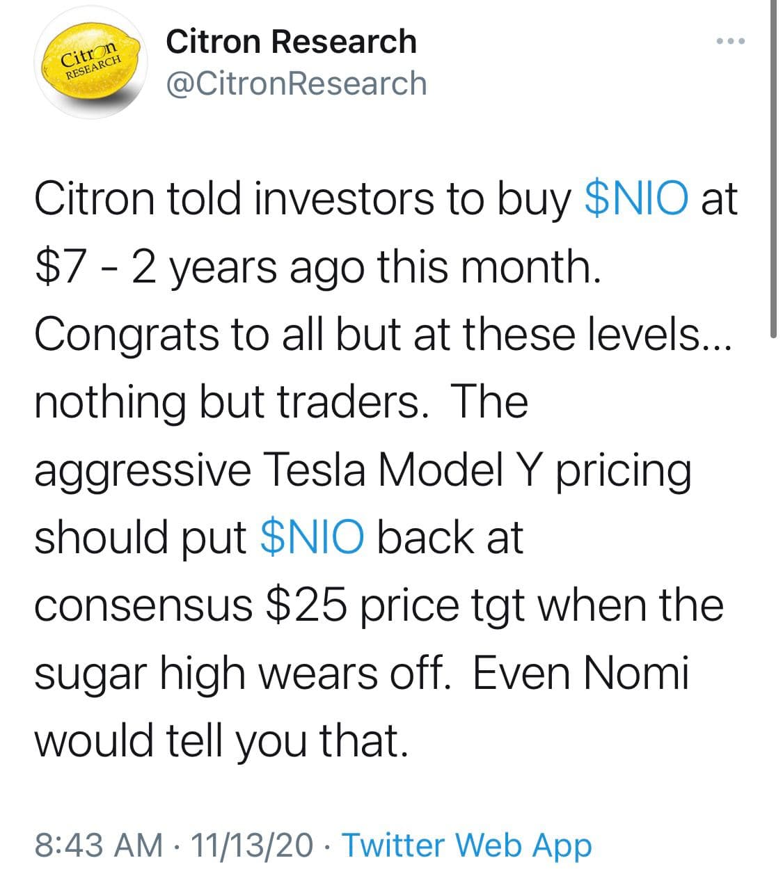 Citron이 NIO ES6을 직접 타보았는지, 중국정부가 EV시장을 밀어주는 것이 Tesla를 위해서인지 자국 기업을 육성하기 위함인지에 대해서 고민해보았는지 궁금해집니다.
