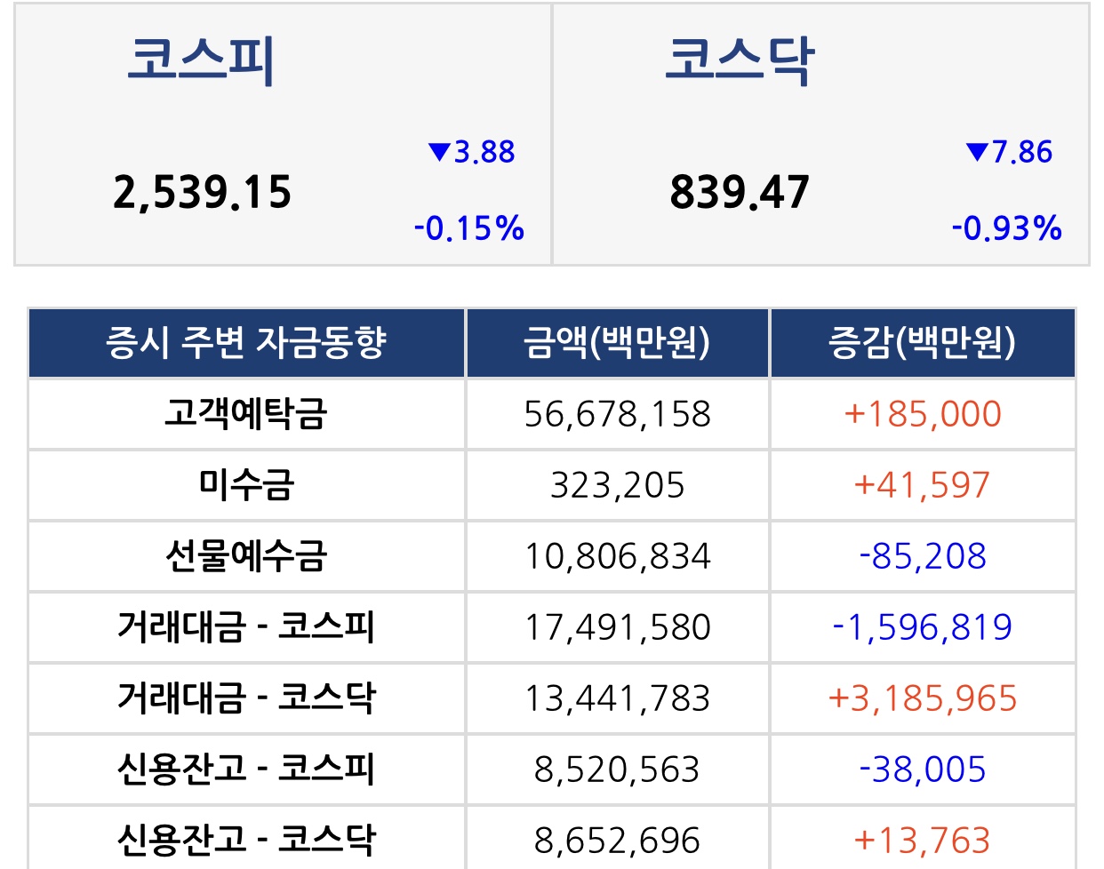 마감 지수 : KOSPI 2,539.15P(-3.88P/-0.15%)