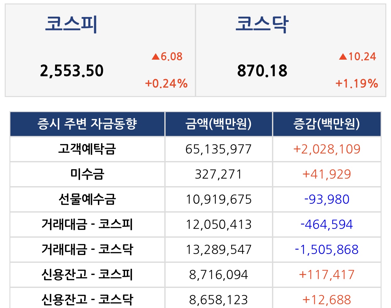 마감 지수 : KOSPI 2,553.50P(+6.08P/+0.24%)