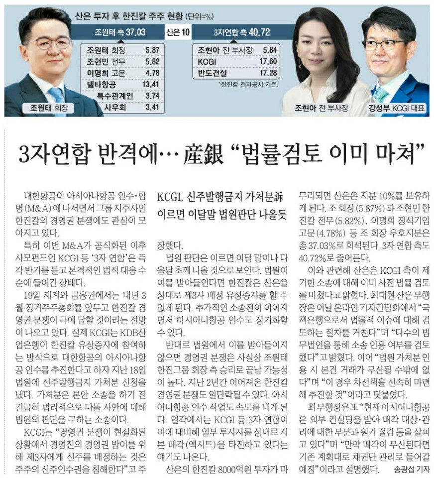 ● 산은 "조원태, 투자합의 의무조항 위반시 퇴진한다"